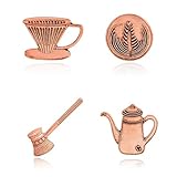 - Design Features: Set of 4 vintage-style coffee-themed brooches including a pour-over dripper, latte art pattern, coffee grinder, and coffee pot designs in copper-tone finish.
